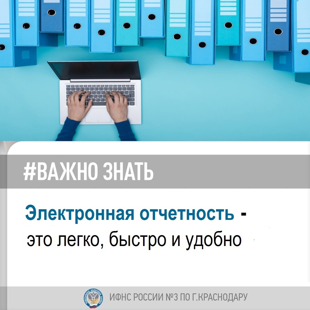 ИФНС России №3 по г.Краснодару информирует о преимуществах сдачи отчётности в электронной форме. Электронная отчётность — это экономия времени и удобство. Направляйте отчётность с вашего компьютера в удобное для вас время и в удобном месте. Не надо тратить время на визит в налоговый орган. ????Для перехода на электронную отчётность необходимо: ✅получить электронную подпись в налоговом органе; ✅выбрать способ направления электронной отчётности. Направлять отчётность можно следующими способами: - через оператора электронного документооборота; - через сайт ФНС России; - через Личный кабинет индивидуального предпринимателя или Личный кабинет юридического лица. Отчетность формируется с помощью программы «Налогоплательщик» или программного обеспечения оператора электронного документооборота, подписывается электронной подписью и направляется в налоговый орган. Переходите на электронную отчётность! Это быстро, доступно и удобно!