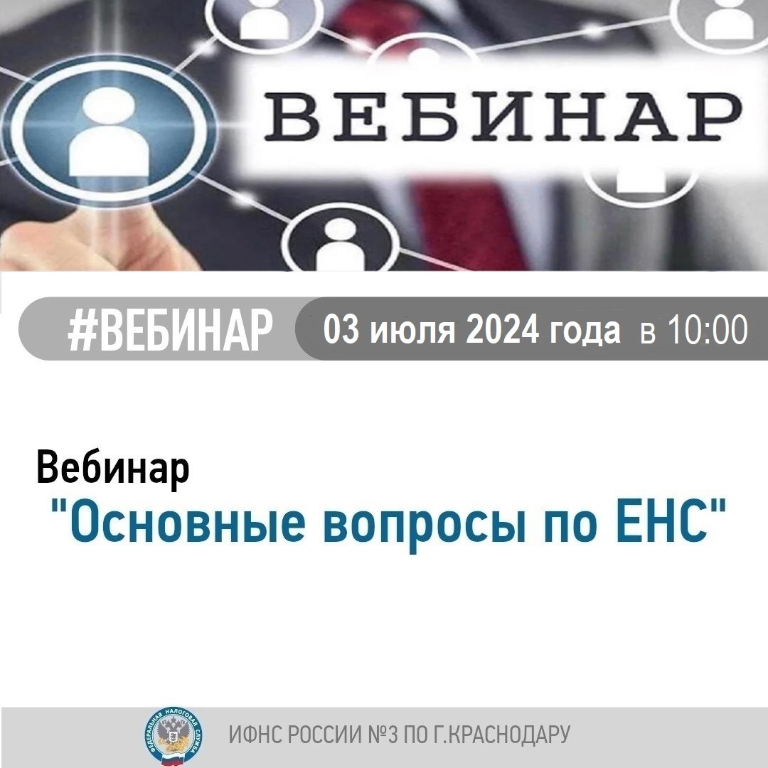 В целях повышения эффективности налогового администрирования приглашаем принять участие в вебинаре на тему «Основные вопросы по ЕНС". Вебинар состоится 03.07.2024 в 10.00. Предварительная регистрация в Инспекции для участия не требуется. Задать вопросы можно заранее по электронной почте: vebinar2309@mail.ru или по телефону: 8(861) 991-46-09 (доб.3178). Принять участие в онлайн – трансляции можно, подключившись по ссылке: https://vs07.nalog.ru/c/8007825968. Предварительно необходимо скачать бесплатное приложение.