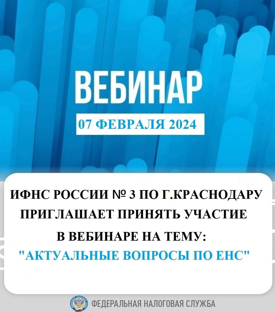 В целях повышения эффективности налогового администрирования приглашаем принять участие в вебинаре на тему «Актуальные вопросы по ЕНС". Вебинар состоится 07.02.2024 в 15.00. Программа вебинара: 1. Порядок начисления пени в условиях ЕНС 2.Порядок направления жалоб по ТКС. 4.Декларирование доходов физических лиц за 2023 год. 5.Информирование о задолженности по смс (электронной почте). 6.ФНС России информирует: зарплата в конвертах – вне закона 7. Льготы по имущественным налогам 8. Получение налоговых уведомлений через ЕПГУ. Предварительная регистрация в Инспекции для участия не требуется. Задать вопросы можно заранее по электронной почте: vebinar2309@mail.ru или по телефону: 8(861)233-68-88 (доб.27). Принять участие в онлайн – трансляции можно, подключившись по ссылке: https://vs07.nalog.ru/c/8007825968. Предварительно необходимо скачать бесплатное приложение