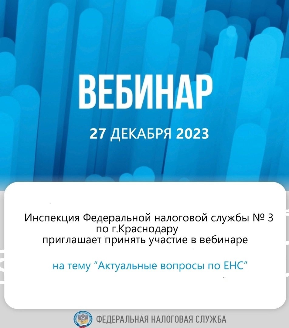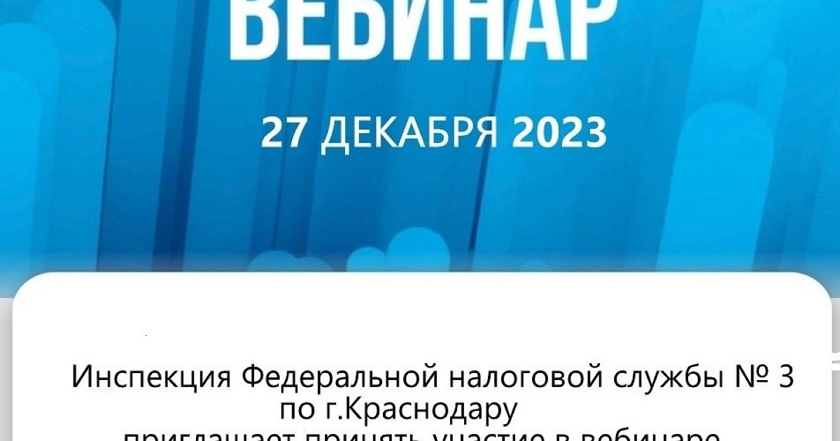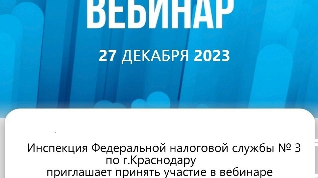 Приглашаем принять участие в вебинаре 27 декабря 2023 года в 15-00 часов. Предварительная регистрация в Инспекции для участия не требуется. Задать вопросы можно заранее по электронной почте: vebinar2309@mail.ru или по телефону: 8(861)233-68-88 (доб.27). Принять участие в онлайн – трансляции можно, подключившись по ссылке: https://vs07.nalog.ru/c/8007825968. Предварительно необходимо скачать бесплатное приложение.