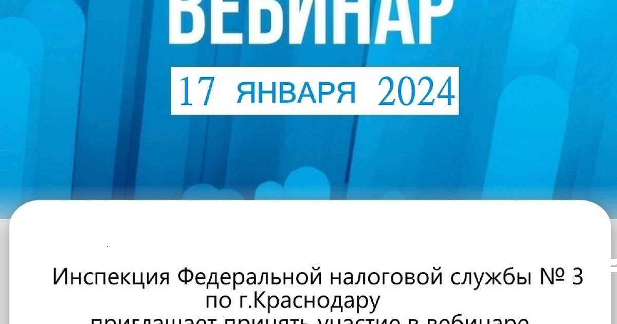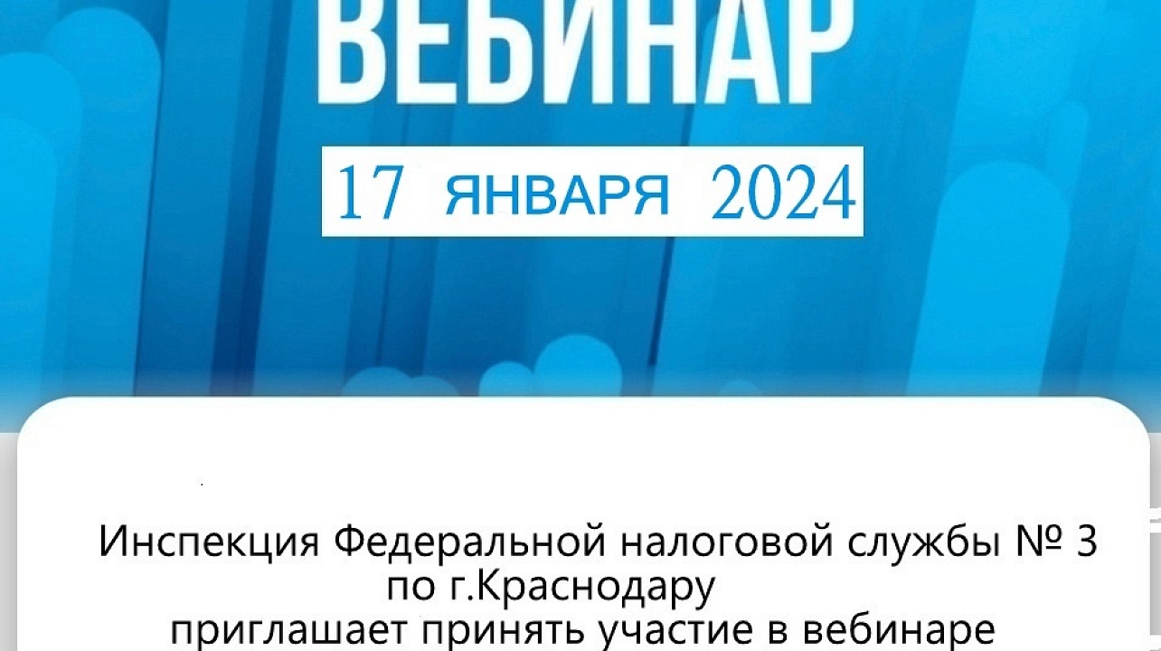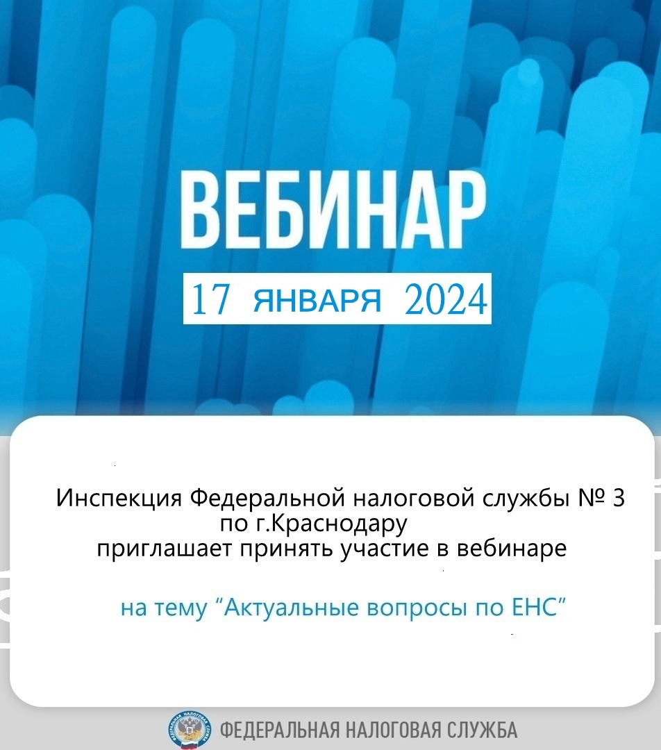ИФНС России № 3 по г. Краснодару приглашает на вебинар 17 января 2024 года в 15-00 часов. Тема вебинара "Актуальные вопросы по ЕНС". Предварительная регистрация в Инспекции для участия не требуется. Задать вопросы можно заранее по электронной почте: vebinar2309@mail.ru или по телефону: 8(861)233-68-88 (доб.27). Принять участие в онлайн – трансляции можно, подключившись по ссылке: https://vs07.nalog.ru/c/8007825968. Предварительно необходимо скачать бесплатное приложение.