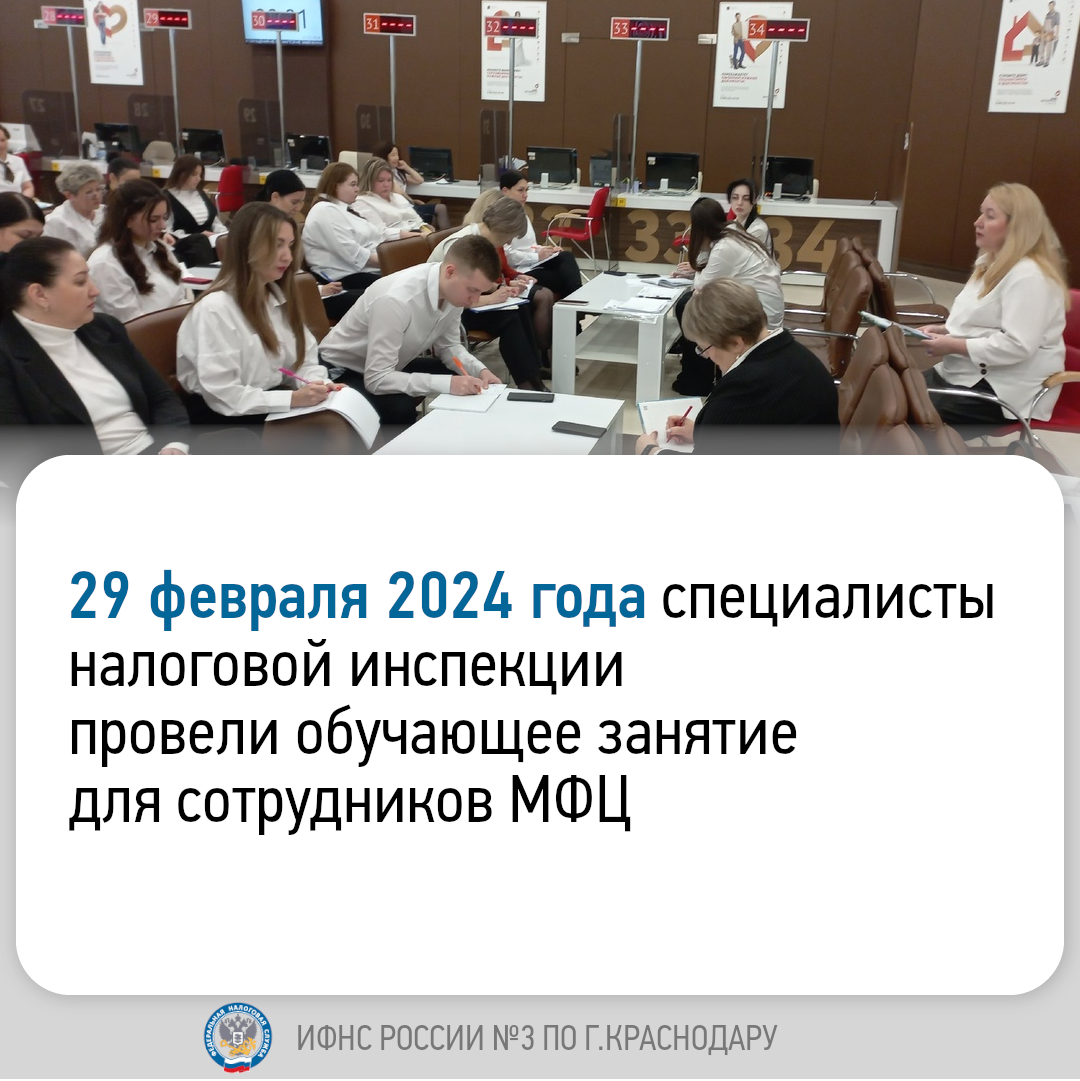 Специалисты ИФНС России № 3 по г. Краснодару провели 29 февраля 2024 года обучающее занятие с сотрудниками ГАУ КК МФЦ