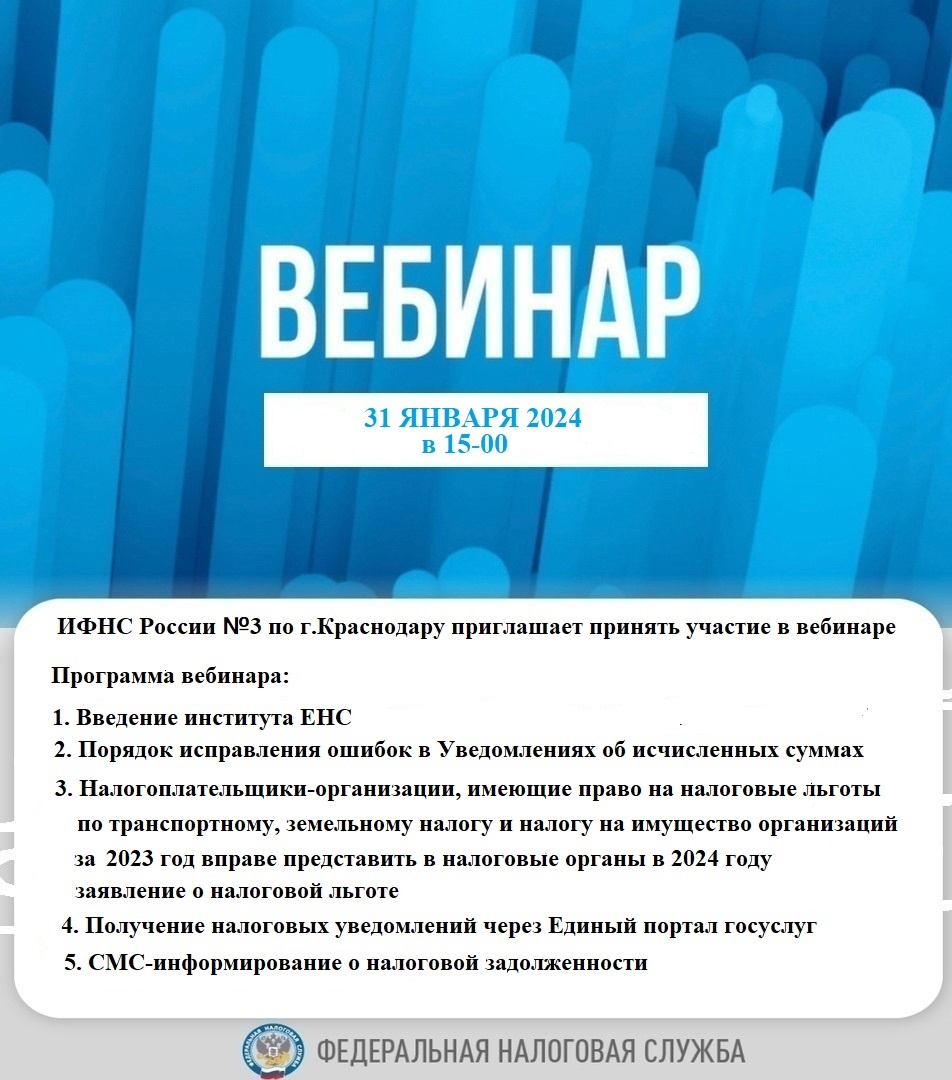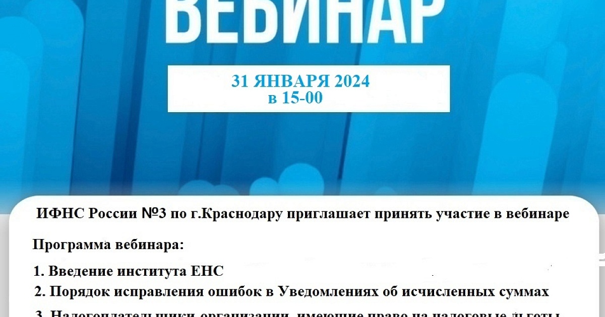 В целях повышения эффективности налогового администрирования приглашаем принять участие в вебинаре на тему «Актуальные вопросы по ЕНС". Вебинар состоится 31.01.2024 в 15.00 Предварительная регистрация в Инспекции для участия не требуется. Задать вопросы можно заранее по электронной почте: vebinar2309@mail.ru или по телефону: 8(861)233-68-88 (доб.27). Принять участие в онлайн – трансляции можно, подключившись по ссылке: https://vs07.nalog.ru/c/8007825968. Предварительно необходимо скачать бесплатное приложение.