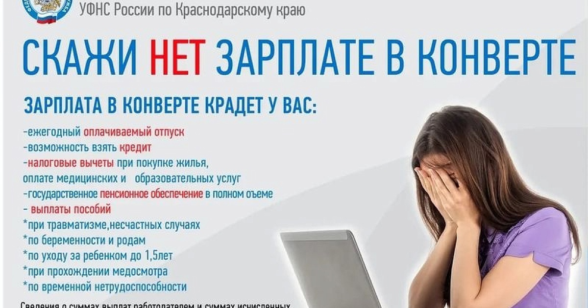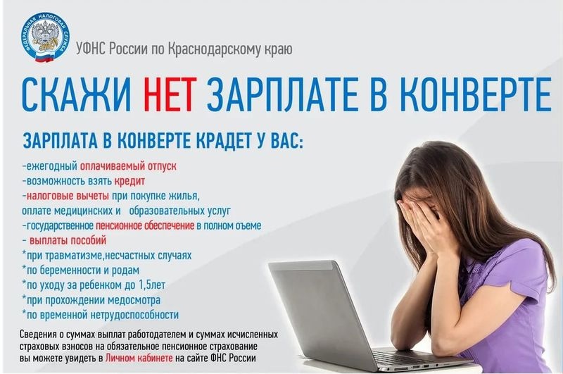 Сложившаяся ситуация с неформальной занятостью и получением «серой» заработной платы является одной из самых актуальных и злободневных проблем в настоящее время. Чтобы сэкономить на налогах, многие работодатели «прячут» часть зарплаты своих наемных работников от официального оформления. Однако граждане должны помнить, что за такие махинации работодателей, обязанность по уплате налога на доходы физических лиц лежит на них самих. Занятость с устной договоренностью о размере заработной платы приводит к негативным последствиям и, соглашаясь на нее, работник дает возможность работодателю: - не производить отчисления из зарплаты работника в пенсионный фонд, а это — отсутствие заслуженного пенсионного обеспечения и мизерные пенсии по старости; - не производить отчисления из зарплаты работника в фонд медицинского страхования, а это — отсутствие возможности получить бесплатное медицинское обслуживание; - не производить отчисления из зарплаты работника в фонд социального страхования, а это — неоплаченные: лист нетрудоспособности, отпуск по беременности и родам, отпуск по уходу за ребенком до достижении им 3-х летнего возраста, сумма полагающегося ежемесячного ущерба в случае трудового увечья или профзаболевания, а также единовременного пособия (в том числе в случае смерти работника); - не удерживать из заработной платы конкретного работника налог на доходы физических лиц, а это — отсутствие возможности получить предусмотренные законодательством социальные, стандартные и имущественные вычеты. Также получение «серой» заработной платы влечет за собой: - отказ в получении банковского кредита; - отказ в выдаче визы; - угрозу привлечения к ответственности за незадекларированные доходы; - отсутствие оснований для обращения в суд за защитой трудовых прав. ❗Необходимо помнить, работник, получивший доход, с которого не уплачен налог, должен САМОСТОЯТЕЛЬНО задекларировать его в установленные законодательством о налогах и сборах сроки. Непредставление декларации и несвоевременная уплата сумм налога влечет за собою ответственность, ведь по ст. 228 НК РФ, за уплату НДФЛ отвечают сами физические лица, если обязанность налогового агента не была исполнена. А в соответствии со ст. 119 НК РФ гражданину грозит штраф в размере 5% от суммы неуплаченного налога за каждый просроченный месяц (до 30% от полной суммы, не менее 1000 руб.). ???? В случае отказа работодателя от оформления трудовых отношений и иных нарушений трудового законодательства, можно обратиться в налоговую или трудовую инспекции, а так же в Прокуратуру.