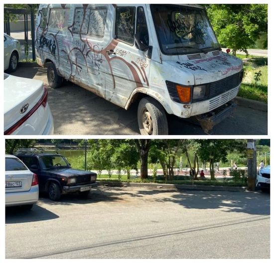 Белый Мерседес Бенс хозяин бросил на улице Карасунской Набережной, 213. Немецкий автомобиль находился в разукомплектованном состоянии: колеса спущены, бампер отсутствует, кузов разрисован. Еще одна машина, черная Волга, на протяжении полугода была припаркована на улице Полины Осипенко рядом с домом 71. Раритет 70-х годов бросили со спущенными колесами.