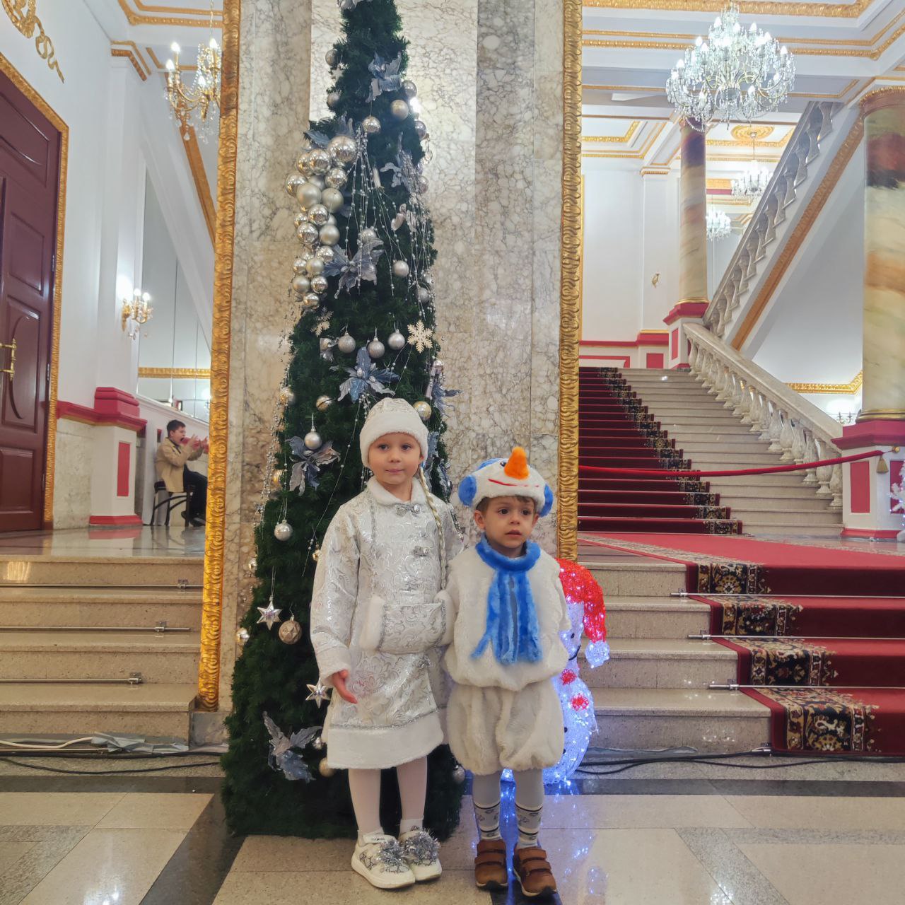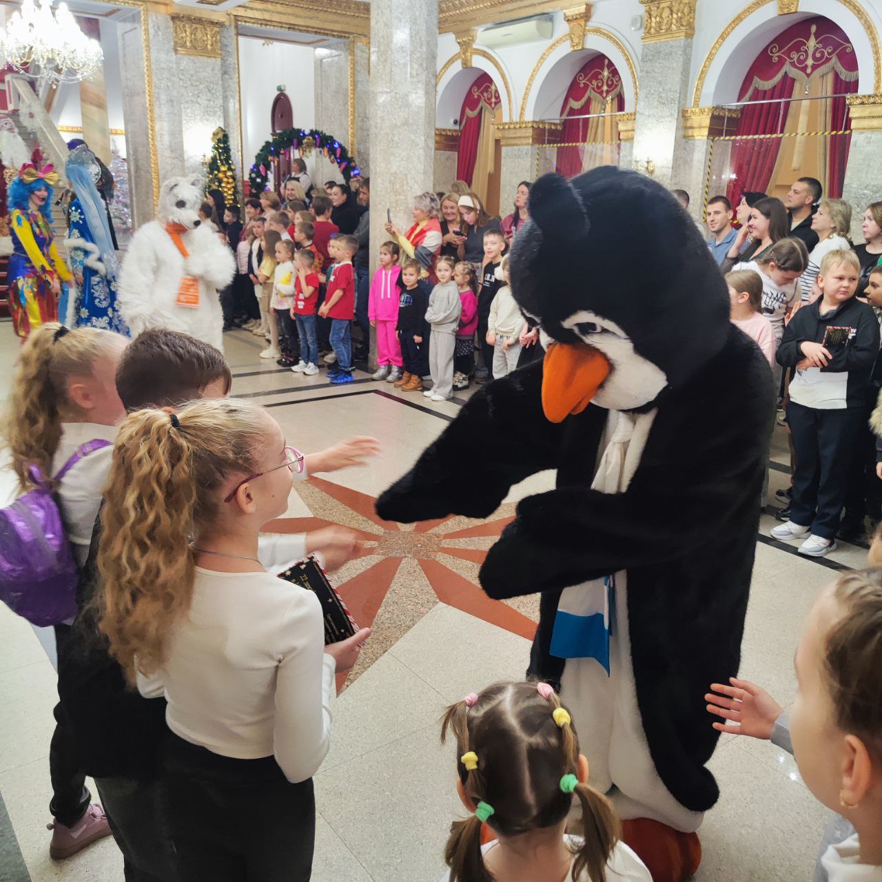 Перед праздничным представлением ребят порадовали веселой интермедией. Дед Мороз, Снегурочка и ростовые куклы провели увлекательные игры, конкурсы и викторины.