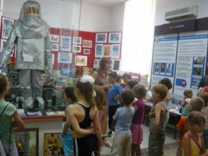 Зрелище сопровождается рассказом о быте огнеборцев и правилах пожарной безопасности. Выставка вызывает неподдельный интерес у школьников, и они становятся активными участниками.
