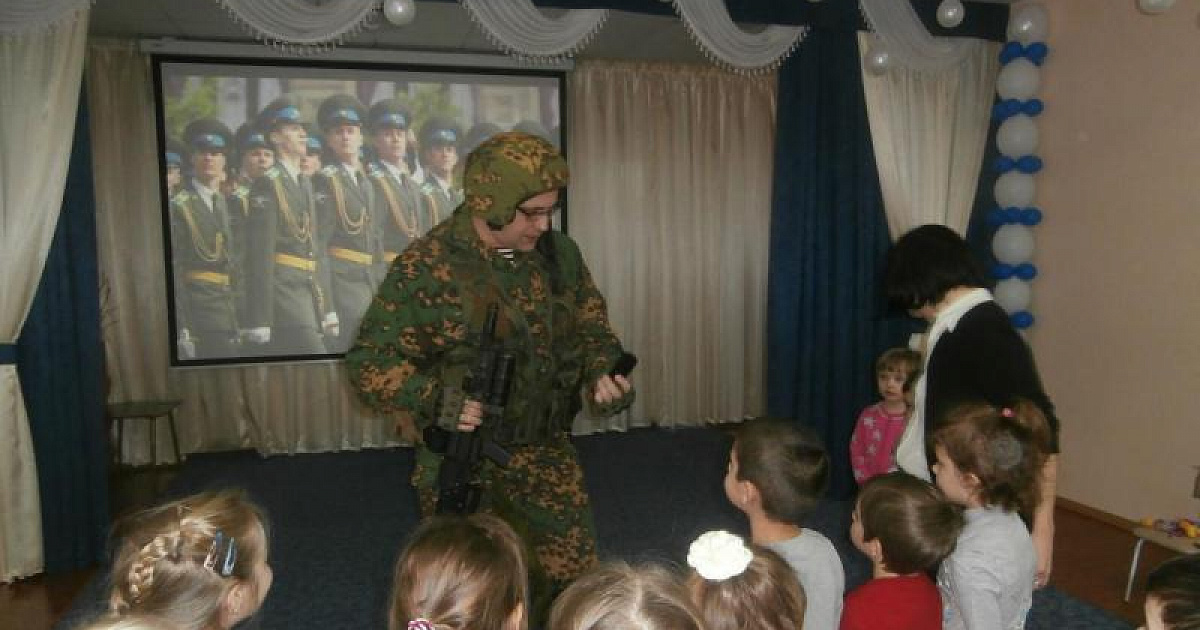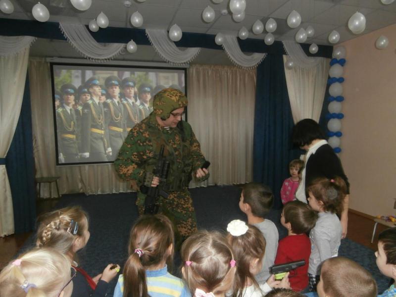 1 февраля 2017Сегодня в гости к ребятам старшей группы детского сада № 139 пригласили солдата. Он рассказал детям о порядке прохождения службы, обмундировании, о воспитании главных качеств настоящего военнослужащего: мужестве, стойкости, выносливости. Вместе с ним, ребята учились маршировать, а самым смелым была предоставлена возможность подержать образцы современного вооружения. Воспитанники вручили гостю подарок. В завершение встречи ребята вместе с воспитателем оформили стенгазету.