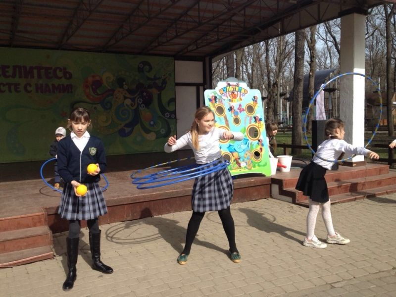 На центральной площади парка развернулись спортивные состязания для маленьких и взрослых. Присутствующие могли продемонстрировать свою ловкость, скорость и сноровку в метании мячей, в тире, преодолеть препятствия, пробежав в тоннеле из обручей.