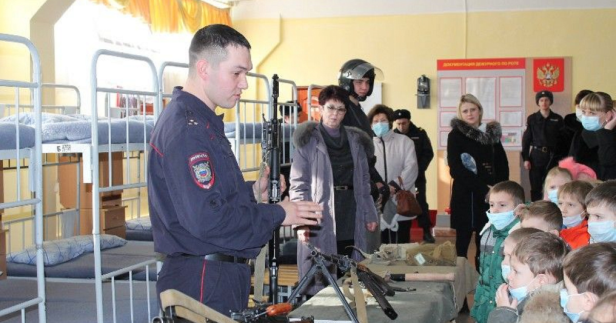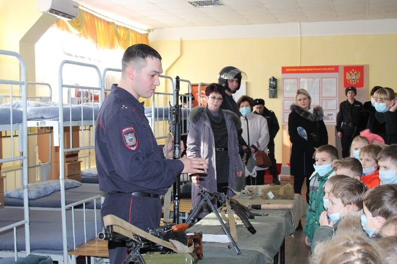 Затем ребятам рассказали об истории части, её достижениях в боевой подготовке и учёбе, традициях, показали образцы вооружения. Каждый ребёнок мог подержать в руке настоящий автомат Калашникова и другие виды оружия. Детям показали, как собирается и разбирается автомат, дали примерить бронежилет и каску. В заключении экскурсанты побывали в кинологическом лагере, где находится вольер с собаками-кинологами и увидели дрессировку собак.