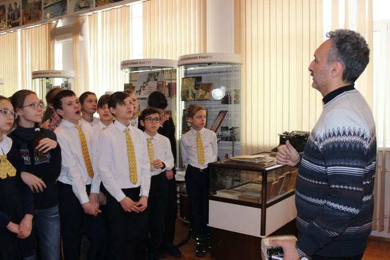 Директор музея КубГТУ Олег Панченко ознакомил ребят с экспозицией "Ветераны Куб ГТУ на фронтах Великой Отечественной войны 1941-1945гг.". Он рассказал о ветеранах войны В.И. Гарбузовой, А.Е. Цуприкове, В.К. Юношевой, А.Д. Ассаулюк и др., которые проявили героизм и мужество при освобождении Сталинграда от немецко-фашистских захватчиков. Этот урок мужества был важен и принят ребятами, так как проходил накануне завершения Сталинградской битвы. Это было заметно по их большому интересу к уроку и экспонатам музея.