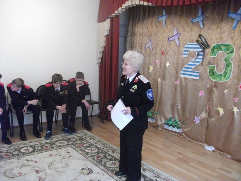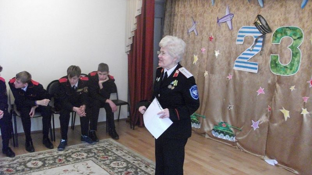 Заместитель атамана по культурно-массовой работе войсковой старшина Юрий Рыхальский, исполняющий обязанности начальника штаба сотник Сергей Фалин, заместитель атамана и руководитель казачьего клуба «Суворовский редут» сотник Юлия Шулепова со своими подопечными, студентами-казаками, рассказали детям о традициях казачества, об участии казаков в сражениях в годы Великой Отечественной войны, о несении службы в казачьем войске ныне.