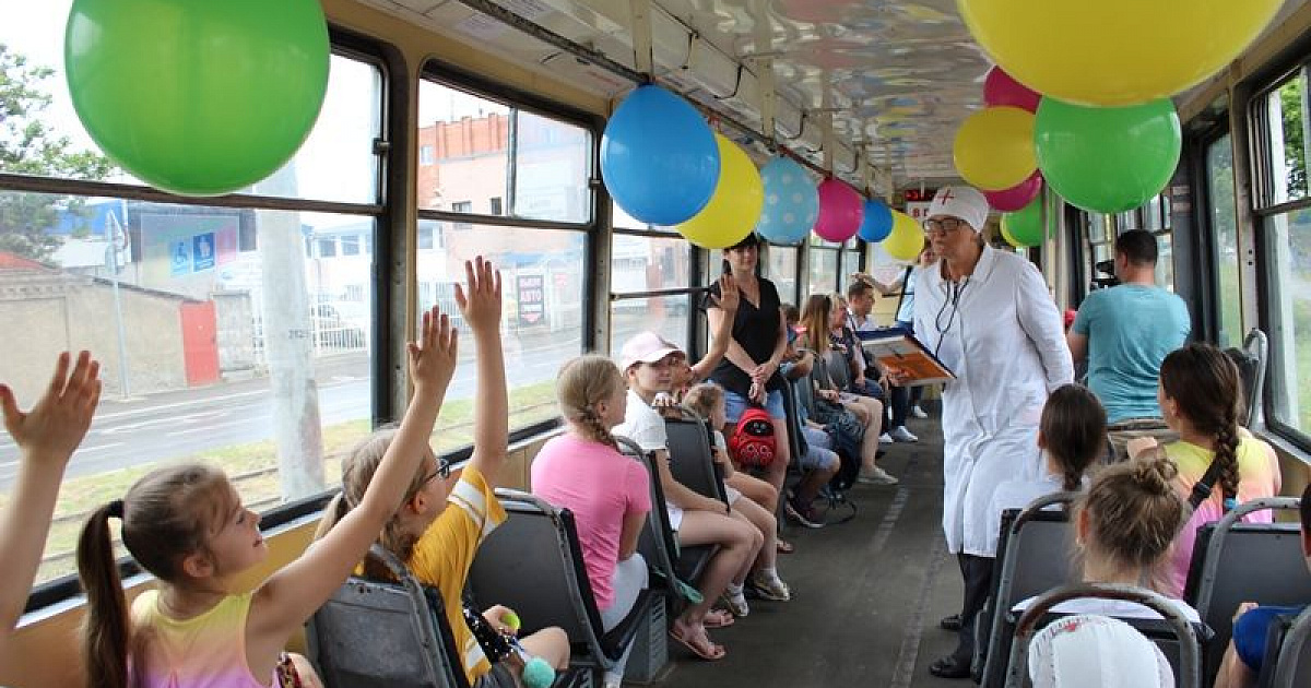 Тематический трамвай со школьниками отправился от Восточного трамвайного депо по маршруту № 12. Сотрудники библиотеки подготовили для ребят праздник с участием ростовых кукол и литературных персонажей, провели веселые конкурсы, литературные викторины и игры.