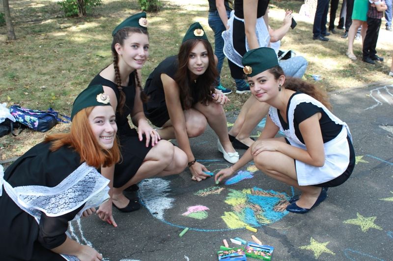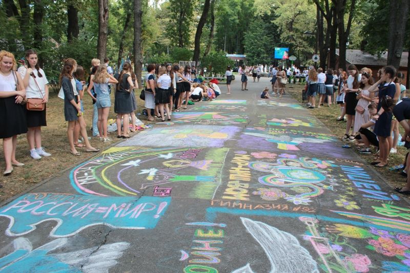 Не обошлось и без конкурса рисунков на асфальте. Разбившись на команды, школьники разрисовали главную аллею парка. Тематика рисунков разнообразная, но в основном, юные художники изображали то, каким они видят мирное небо, выражали любовь к семье, к своему дому, к своей стране.