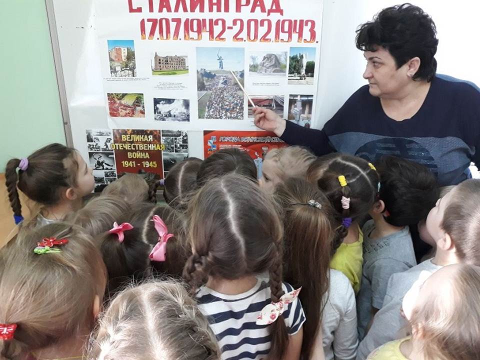Они также поведали дошколятам о мемориале «Вечный огонь», монументе Родина-мать на Мамаевом кургане, музее-панораме «Сталинградская битва» и «Зале Воинской славы», которые сегодня отражают все величие победы в этом легендарном сражении.
