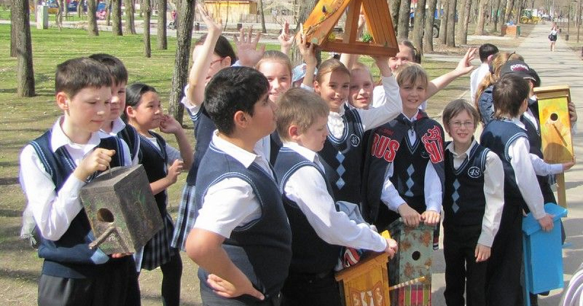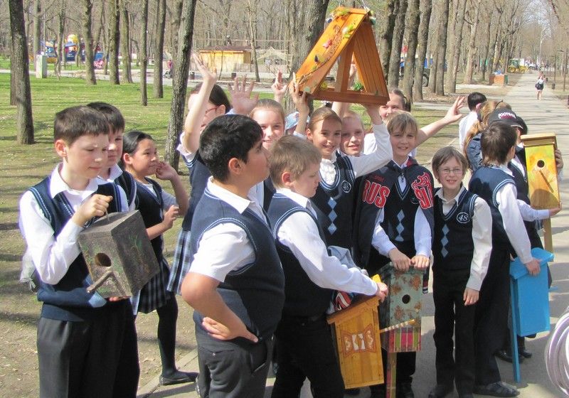 Завершилось мероприятие сооружением "Птицеграда" – школьники развесили на деревьях парка самодельные скворечники и кормушки.