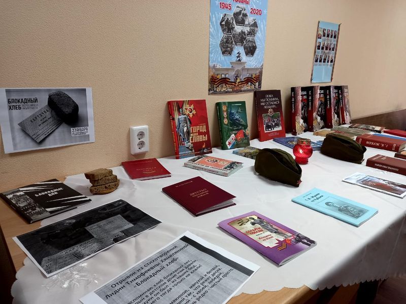 Общественники принесли тематические книги, фотографии фронтовиков, зажгли свечу памяти. Кроме того, территориальный центр присоединился к Всероссийской акции памяти «Блокадный хлеб». В центре экспозиции выставлен символ акции – порция хлеба весом в 125 граммов, такой паек получали жители Ленинграда в самые тяжелые времена блокады.
