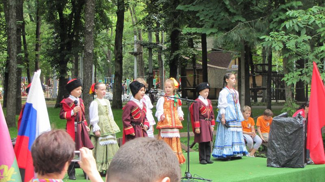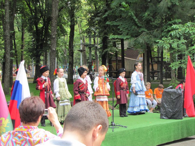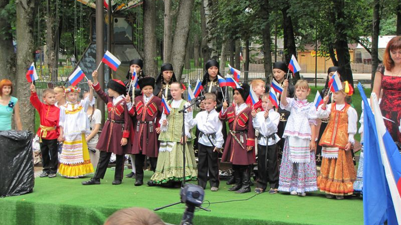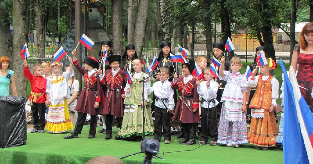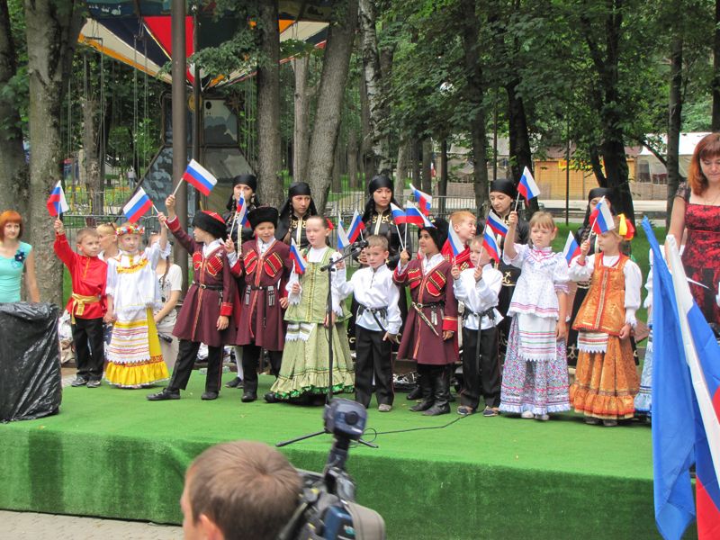 В преддверии главного праздника нашей страны на центральной площадке парка собрались детский ансамбль "Скрыня" Центра детского творчества "Содружество" и танцевальный коллектив "Сэтэнэй", приехавший из Тахтамукайского района — побратима Центрального округа.