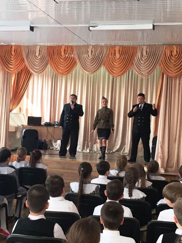 Творческий коллектив исполнил песни о войне, об истории, о героях войны. Прозвучали всем известные песни: «Катюша», «Казаки», «Эх, дороги…» Ребята подпевали знакомые им песни, отвечали на вопросы. Вокалисты были в военных костюмах, играли на народных инструментах. В конце мероприятия был исполнен гимн Кубани.