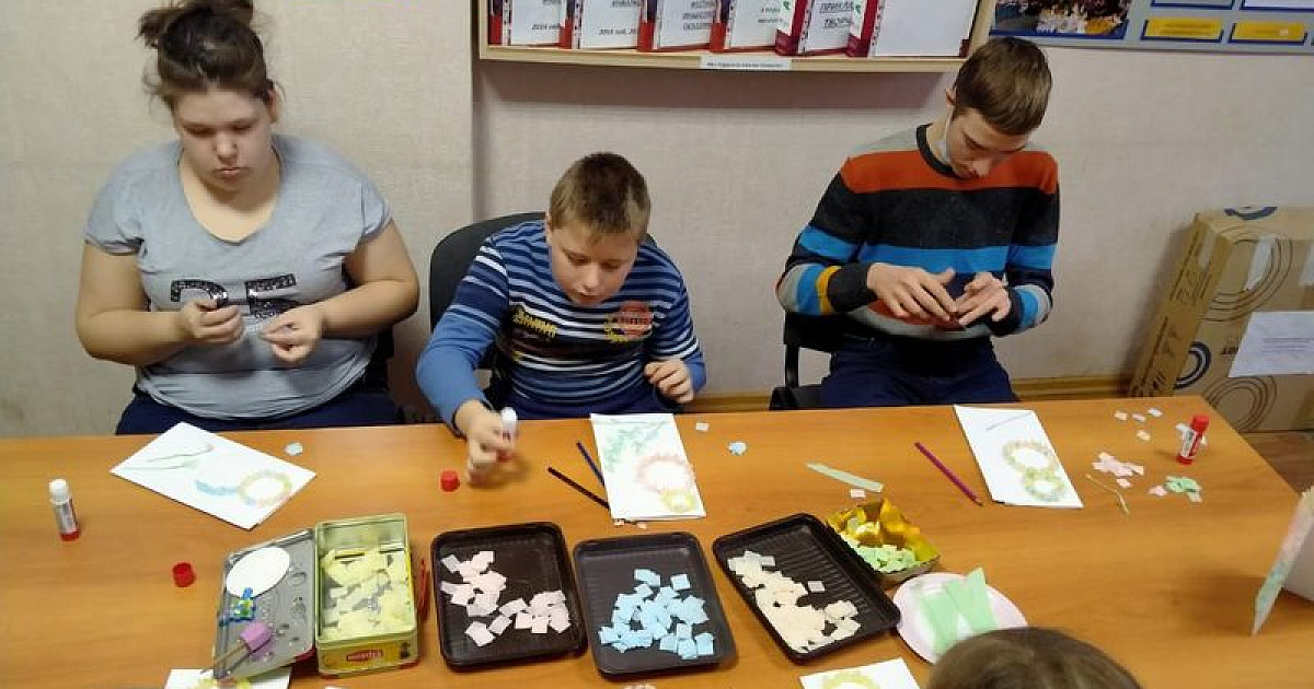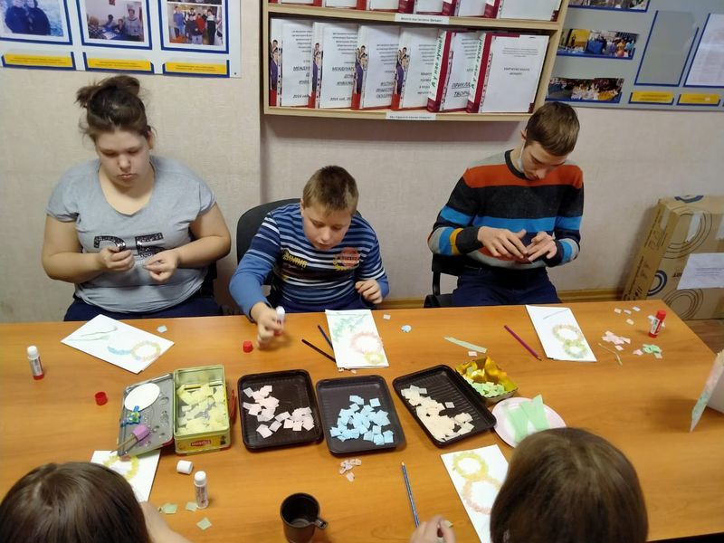 Детям с ограниченными возможностями здоровья показали, как из обычных бумажных салфеток, можно сделать яркую подарочную открытку. Работая с небольшими элементами салфеток, мальчишки и девчонки развивают мелкую моторику, что особенно важно для реабилитации детей-инвалидов. Ни одна открытка не повторилась, каждый из участников старался добавить свою идею, найти свой стиль, цветовую палитру.
