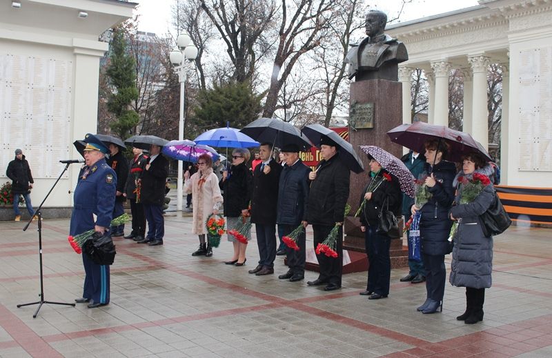 В сквере им. маршала Г. К. Жукова состоялось мероприятие, посвященное празднованию Дня Героев Отечества. В торжественной церемонии приняли участие заместитель главы краевого центра Алексей Удовенко, председатель городской Думы Краснодара Вера Галушко, глава администрации Центрального округа Елена Малова, курсанты военных вузов, Краснодарского президентского кадетского училища, студенты, школьники, представители казачества, общественных организаций, председатели ТОС, жители округа.