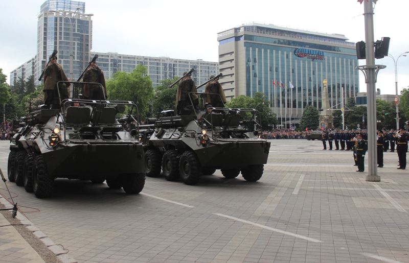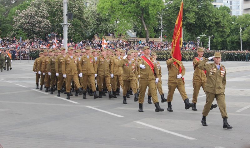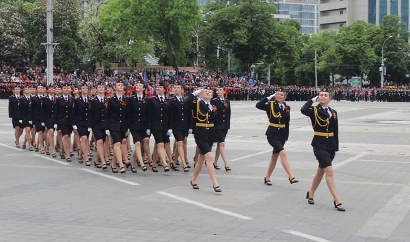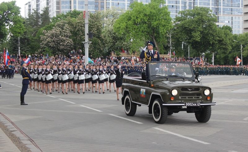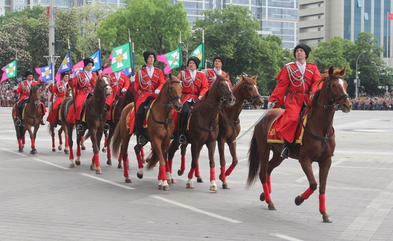 За ветеранами торжественным маршем прошли парадные расчеты и конная группа Почетного караула Кубанского казачьего войска. Всего в прохождении войск приняли участие более 2000 человек. Среди них — военнослужащие соединений и воинских частей Краснодарского гарнизона, казаки Кубанского казачьего войска, курсанты кадетских корпусов Краснодарского края и Краснодарского президентского кадетского училища, ветераны боевых действий, парадные расчеты управления МВД РФ по Краснодарскому краю и ГУ МЧС РФ по Краснодарскому краю.