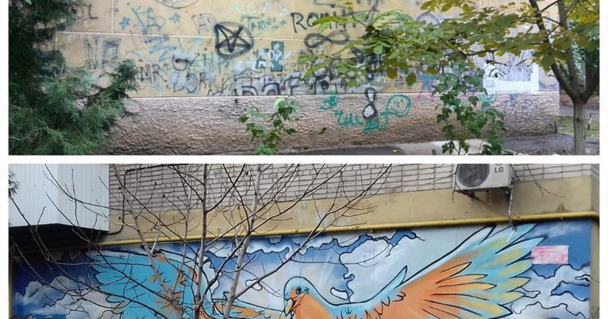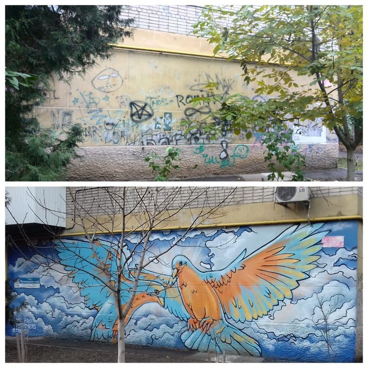 По просьбе главы округа депутат городской Думы Виталий Новиков пообещал решить эту проблему. При его поддержке специалисты управления по делам молодежи совместно с художниками закрасили надписи и нанесли рисунок, эскиз которого предварительно оговорили с жильцами дома. Из всех предложенных проектов активисты выбрали изображения голубя как символа мира и добра.