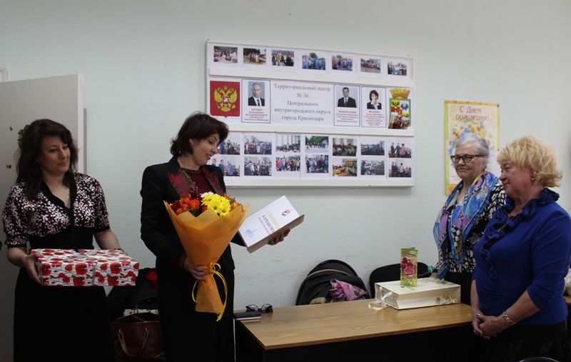 12 апреля 2017Председатель ТОС № 547 Людмила Васильевна Карнакова отметила 70-й день рождения. Поздравить именинницу пришла глава администрации Центрального округа Елена Малова, она передала персональное поздравление от руководителей города Краснодара и вручила памятный подарок.