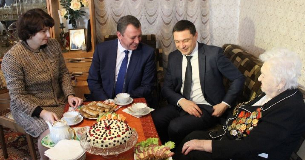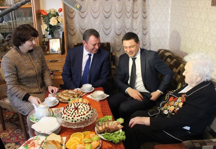 Одной из первых глава города Евгений Первышов и глава администрации Центрального округа Елена Малова посетили Надежду Сергеевну Самарскую. По состоянию здоровья она практически не выходит из дома, но всегда рада гостям. Надежда Сергеевна пригласила Евгения Алексеевича и Елену Юрьевну к столу, где за чашечкой чая рассказала о своем боевом пути.