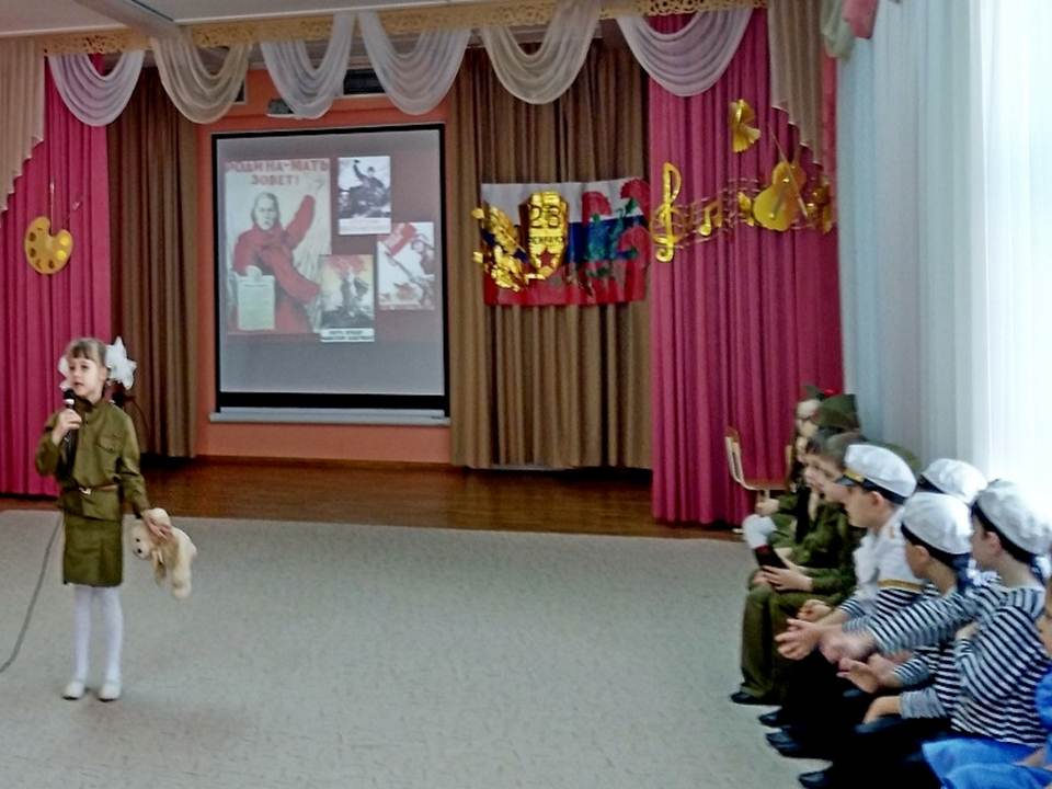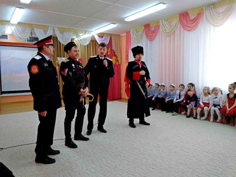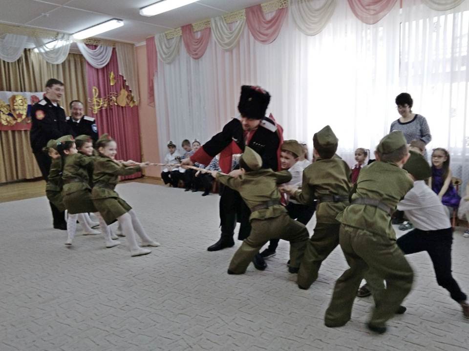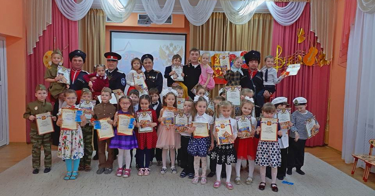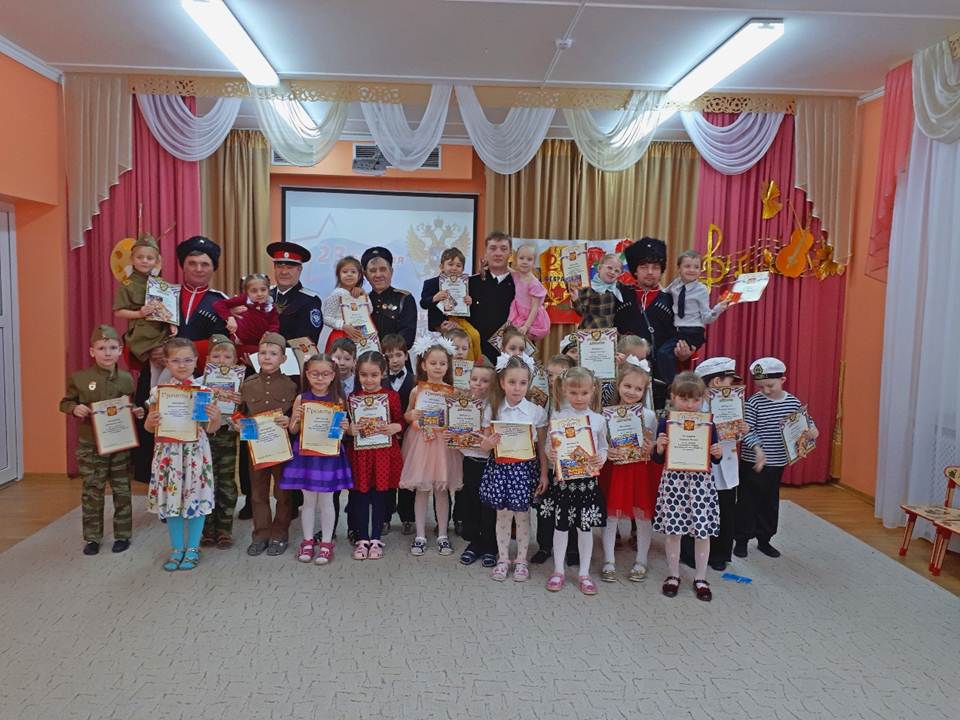 В дошкольной организации много традиций. Одной из них является конкурс чтецов «Мы славим вас, солдаты – ветераны». В этом году 67 конкурсантов из старших и подготовительных групп эмоционально и воодушевленно читали стихи о чести, доблести и славе тех, кто добыл победу на полях военных сражений. Одетые в военную форму, дети очень проникновенно читали стихи, как будто сами проживали те события, о которых рассказывали. В гости к дошколятам пришли кубанские казаки во главе с председателем Совета стариков хуторского казачьего общества «Автомобилист», есаулом Станиславом Васильевичем Батычко. Они рассказали о службе Отечеству, об истории казачьей формы, о предназначении каждого элемента, а также об оружии казаков – шашке, сабле, кинжале, плети. Гости продемонстрировали детям мастерство владения оружием, чем привели их в восторг. Умудренные жизненным опытом люди с удовольствием играли с дошколятами: перетягивали канат и проходили эстафеты. Все ребята были удостоены дипломов.