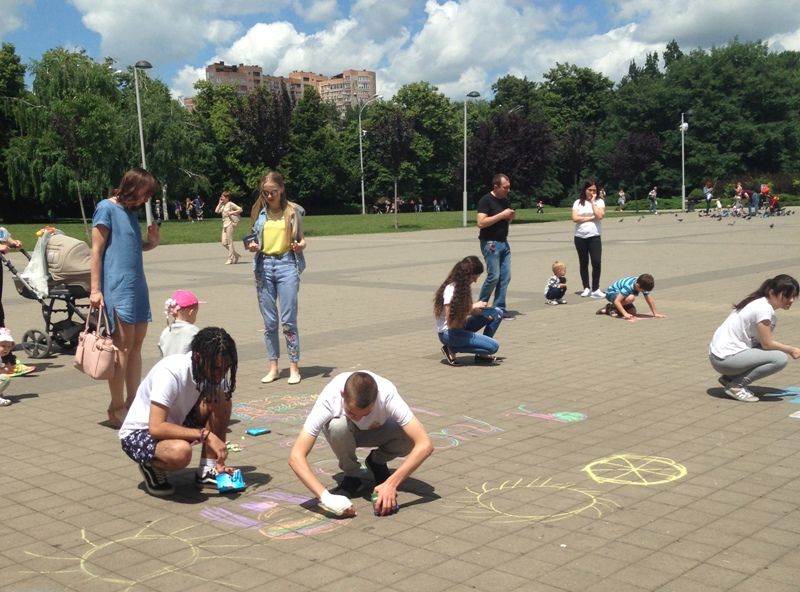 Продемонстрировать свои творческие способности желающих оказалось много. Самым маленьким помогали родители и представители молодежного Совета. Несмотря на то, что тема творческого задания была для всех одна: «Я рисую мир!», рисунки получились разными и яркими. Юные художники изобразили космос, планеты со спутниками, но чаще рисовали солнце и цветы. Синие, желтые, красные и зеленые краски украсили летнюю площадку у подножия мемориального комплекса.