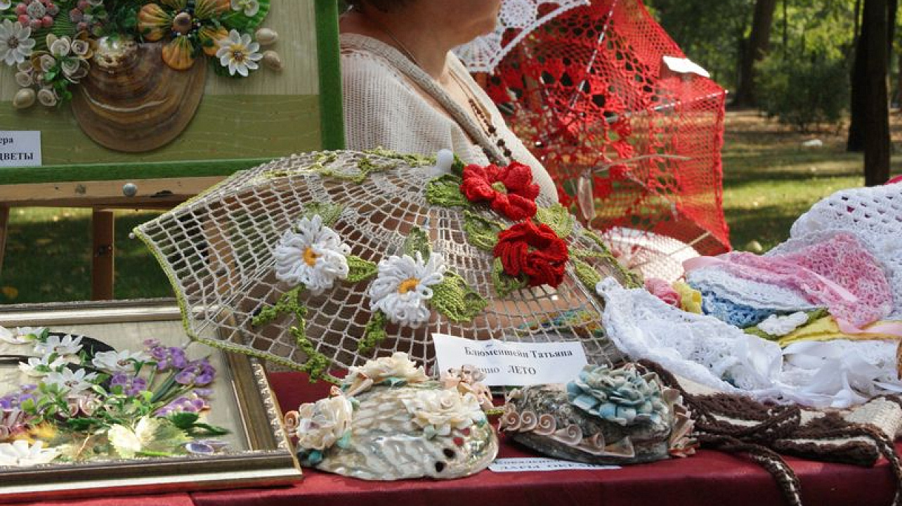 В самом начале путешествия, на станции "Выставочная" гости посетили выставку поделок, где были представлены и кружевные вышитые салфетки, и плетеные из бисера золотые колоски пшеницы и ажурные зонтики. Все экспонаты общественники делали своими руками.
