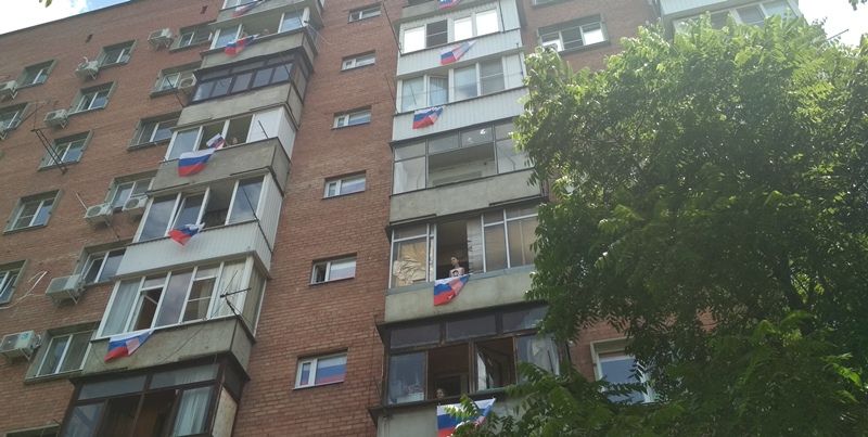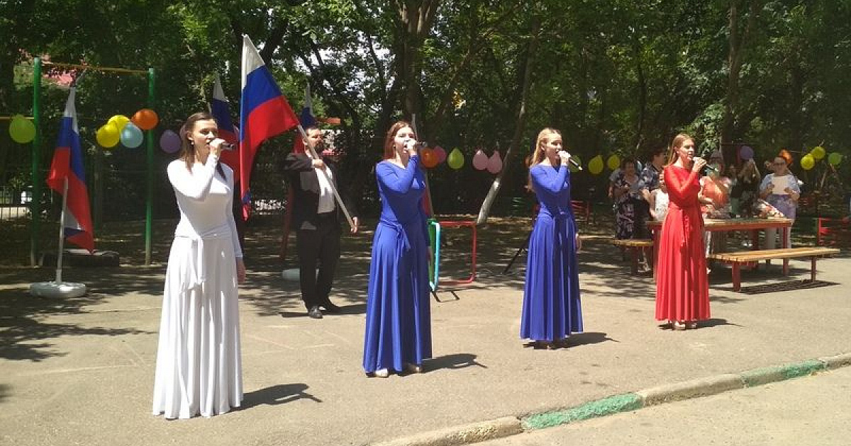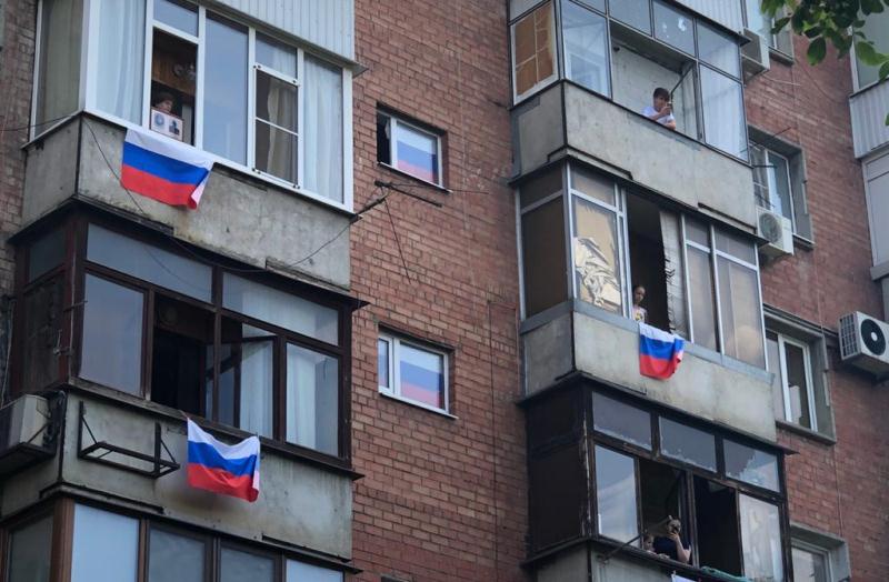 Собственники квартир развесили на своих окнах триколор, вышли на балконы и исполнили самую главную песню страны - Гимн Российской Федерации. Их поддержали творческие коллективы Домов культуры Центрального округа, которые организовали небольшой тематический концерт во дворе этого дома. Для зрителей звучали песни о России и о любви к своей Родине.