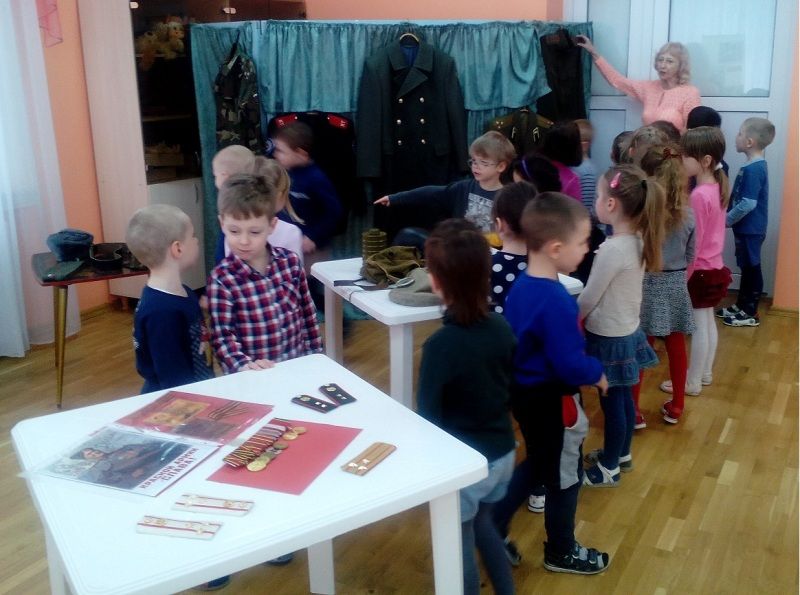 Там представлены экспонаты и фотографии времен Великой Отечественной войны. Дошкольники смогли увидеть фляжки, каски, противогаз, рассмотреть военную форму и головные уборы солдат, офицеров. Особый интерес у ребят вызвало солдатское удостоверение о награждении. Они увлеченно слушали рассказ о боевых подвигах совершенных в годы войны и рассматривали медали.