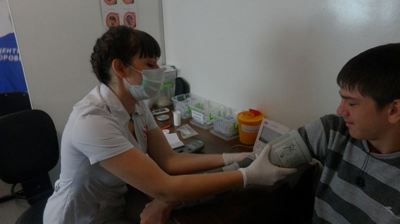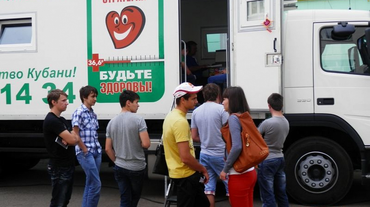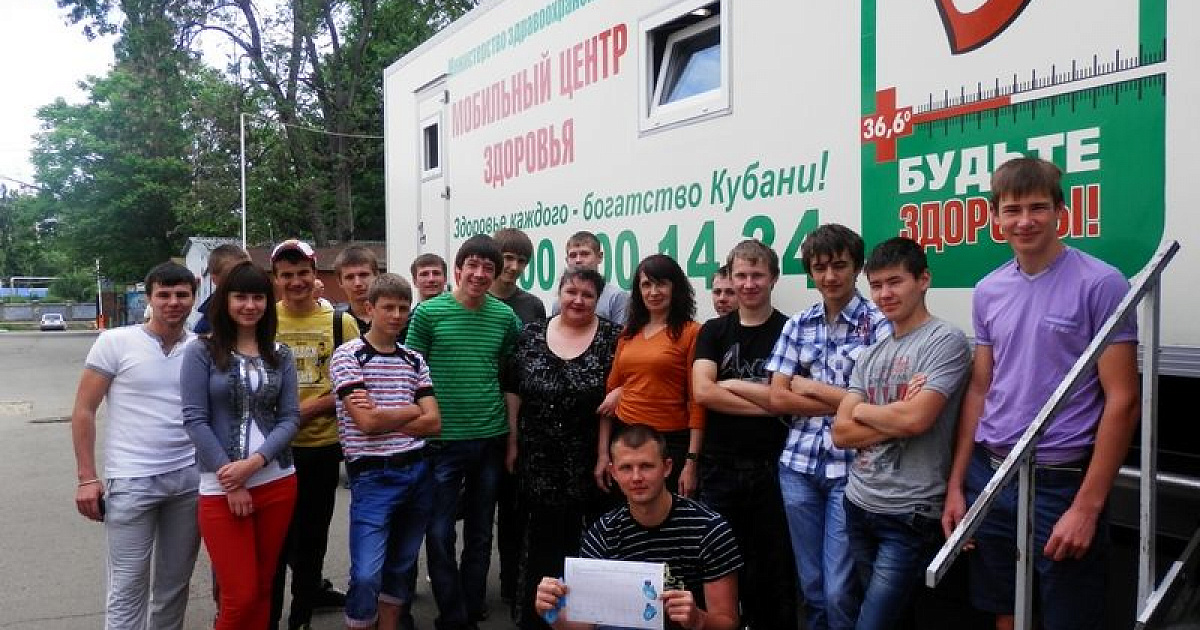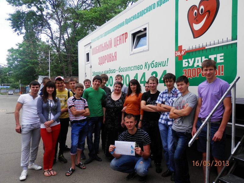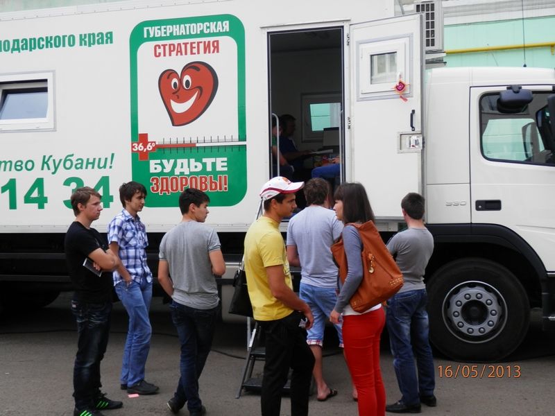 К студентам приехал передвижной медицинский комплекс «Мобильный центр здоровья» Центра медицинской профилактики Министерства здравоохранения Краснодарского края. Он работает в рамках губернаторской стратегии «Будьте здоровы!».