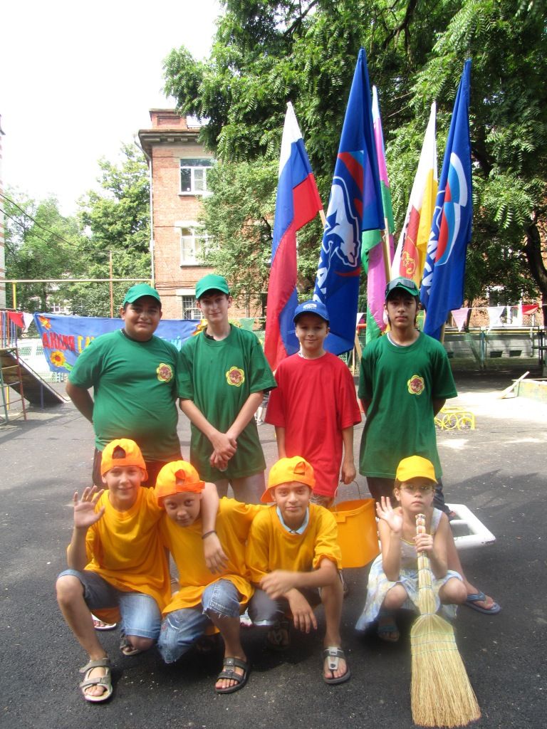 Команда на старт дана! Все мальчишки и девчонки в разноцветных футболках с эмблемами команд с вениками и лопатами в руках убирают свой двор. Четыре команды и у каждой свои обязанности. «Чистюли» – подметают двор, «Капельки» – поливают цветы, «Зеленый патруль» – окапывают деревья, а команда «Помощники природы» - красят оградки детской площадки, следят за экологией своего любимого зеленого уголка.