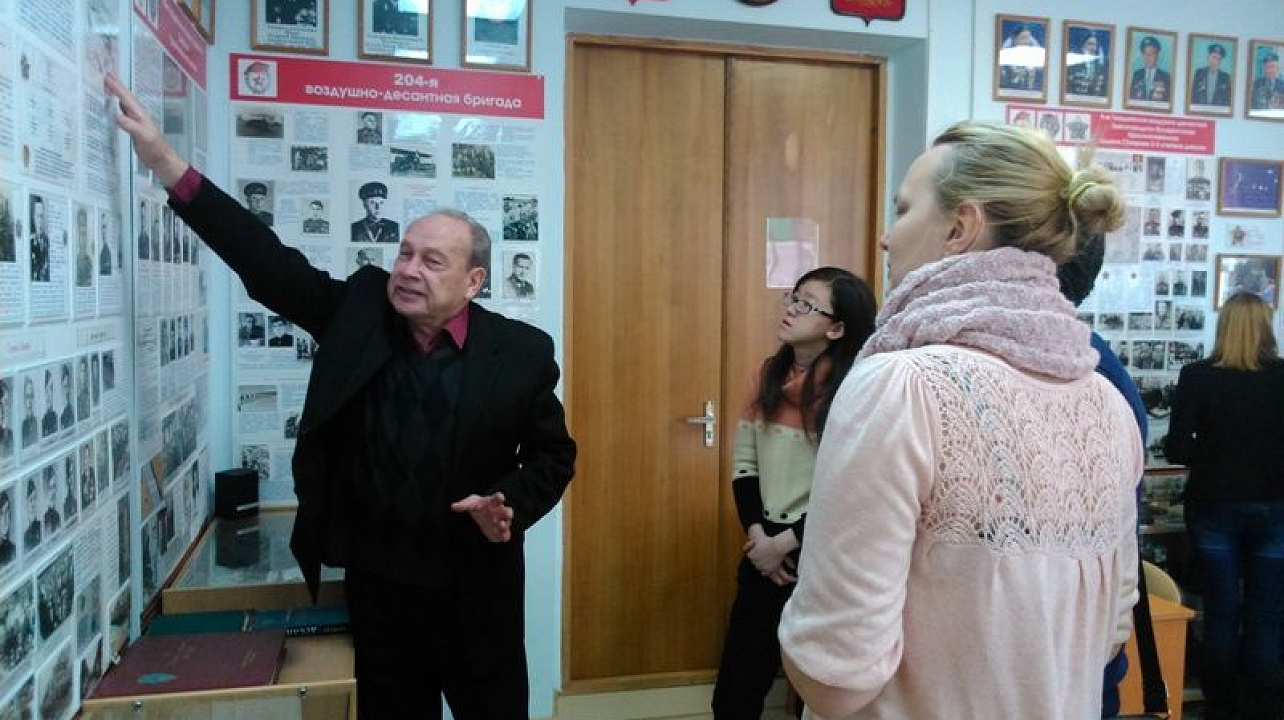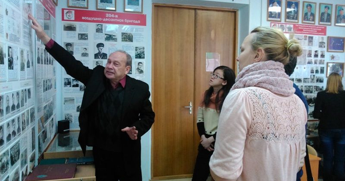В Краснодар студенты из Индии, Сингапура, Италии прибыли по обмену опытом и с большим удовольствием побывали на экскурсии в школьном музее. Директор музея Олег Шахметов рассказал ребятам о подвигах советских солдат, участвующих в Великой Отечественной войне, о мужестве и доблести десантников - героев Советского Союза.