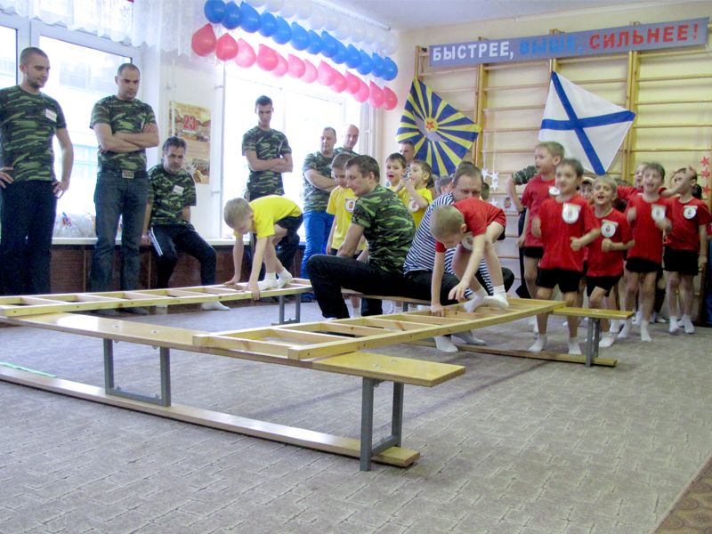 Прошедшее мероприятие представляло из себя соревнования "Мы растем достойной сменой". Детсадовцы вместе со своими папами разделились на две команды "Летчики" и "Моряки" и состязались в двенадцати эстафетах.