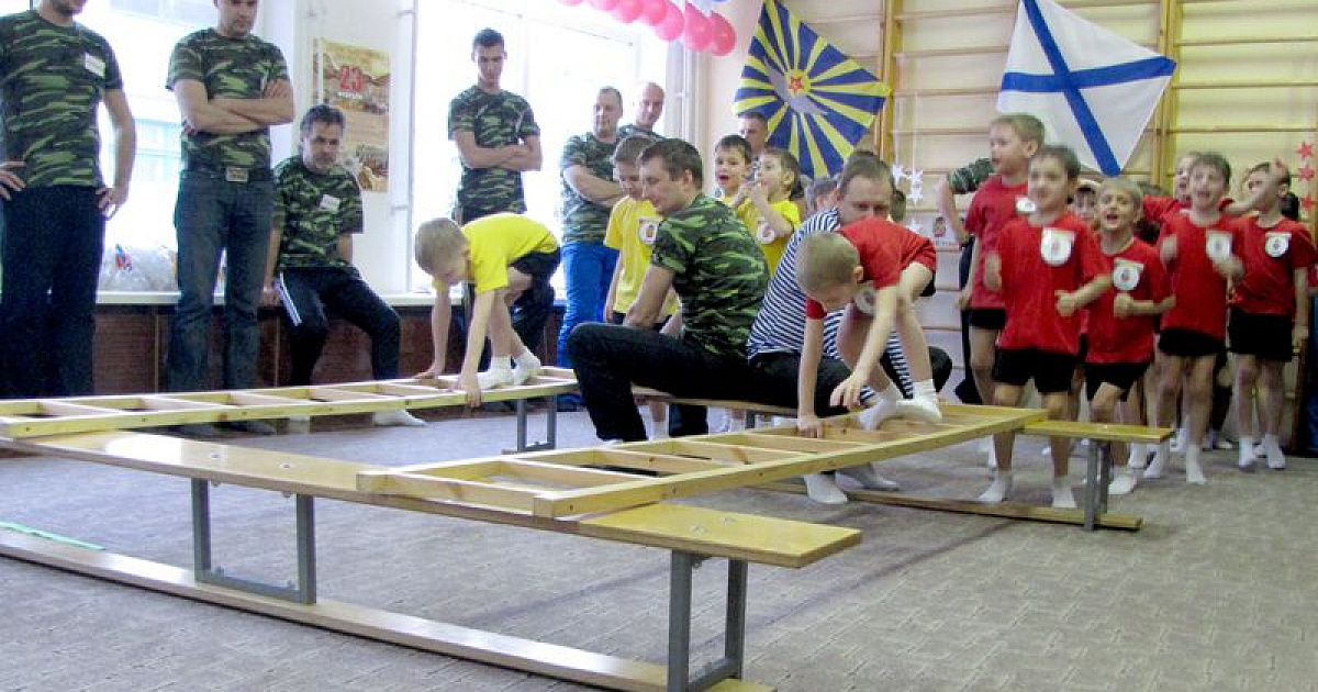 Мальчики и их отцы показывали свои умения в испытаниях: "Мы кавалеристы", "Выкати пушку", "Поднеси снаряд", "Подвесной мост" и "Полет на истребителе".