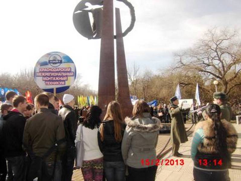 Студенты Краснодарских высших и средних специальных учебных заведений проследовали строем по улице Красной от улицы Хакурате до памятника «Сынам Кубани, павшим в Афганистане», где состоялся митинг Памяти. Инициатором шествия стало городское управление по делам молодежи.