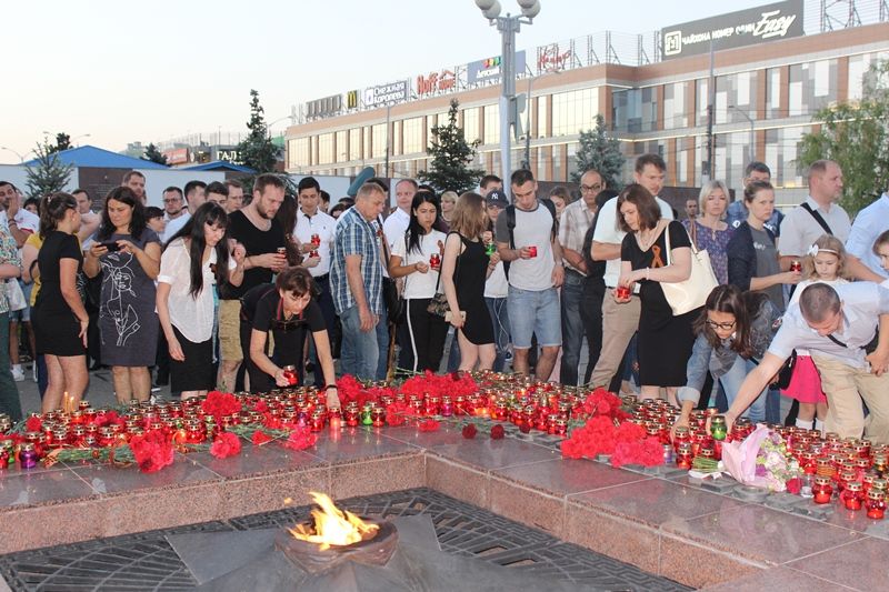 На площади Памяти Героев у мемориального комплекса прошел траурный митинг-реквием. Собравшиеся принесли к Вечному Огню сотни зажженных свечей и почтили минутой молчания память тех, кто отдал свои жизни во имя Победы.