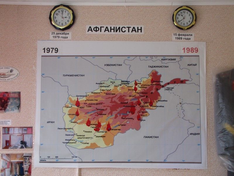 Здесь представлены письма родственникам, мундиры с наградами, вырезки из газет и периодики. Центральное место в экспозиции занимает карта военных действий в Афганистане и время начала и окончания войны и боевые трофеи – учетные карточки душманов и знамя одной из боевых афганских группировок.