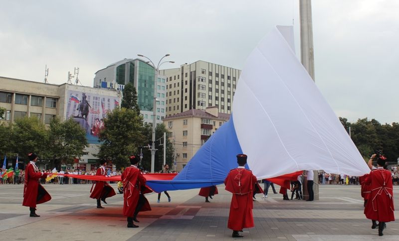 После приветственных слов руководителей города Почетный караул Кубанского казачьего войска вынес на Театральную площадь государственный флаг России. Под звуки гимна флаг был поднят на центральный флагшток.