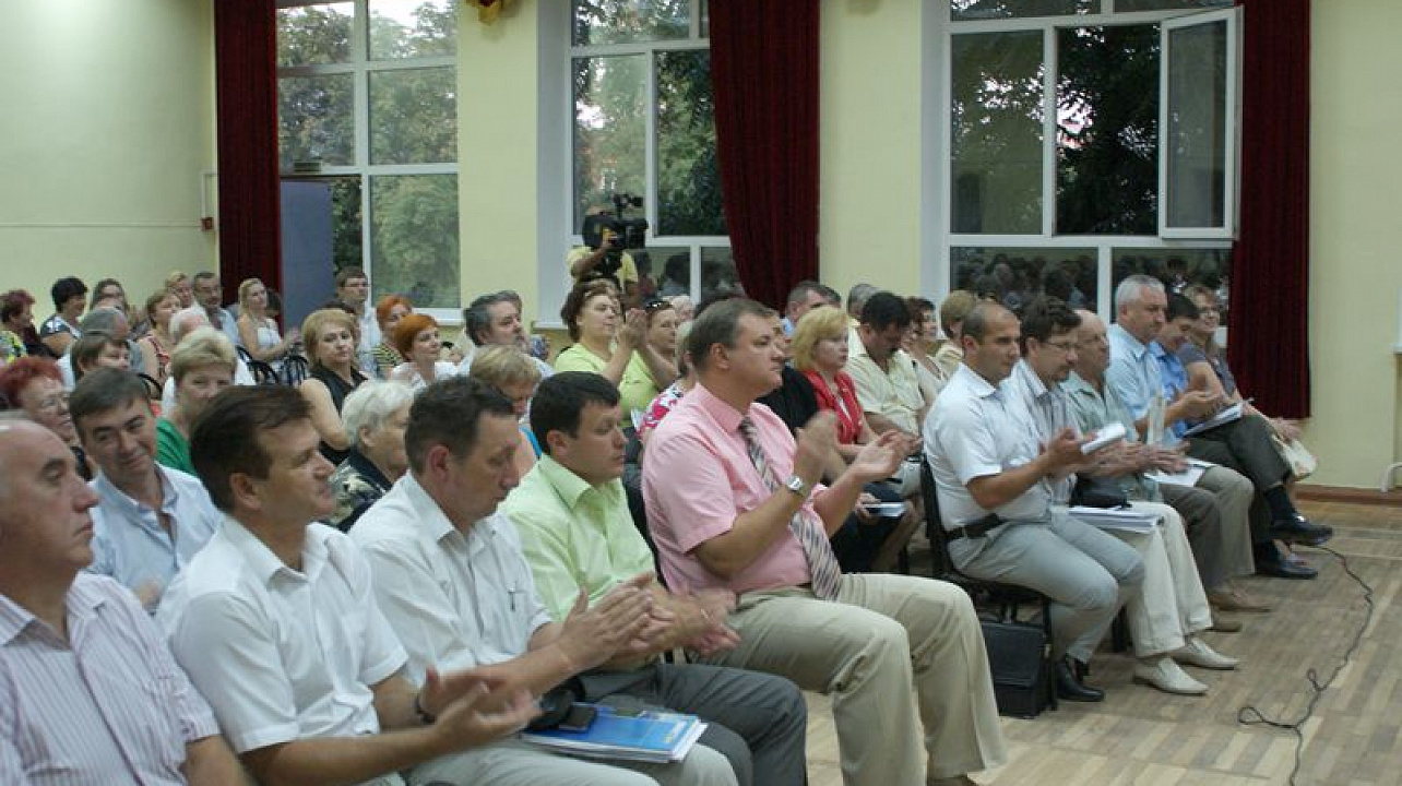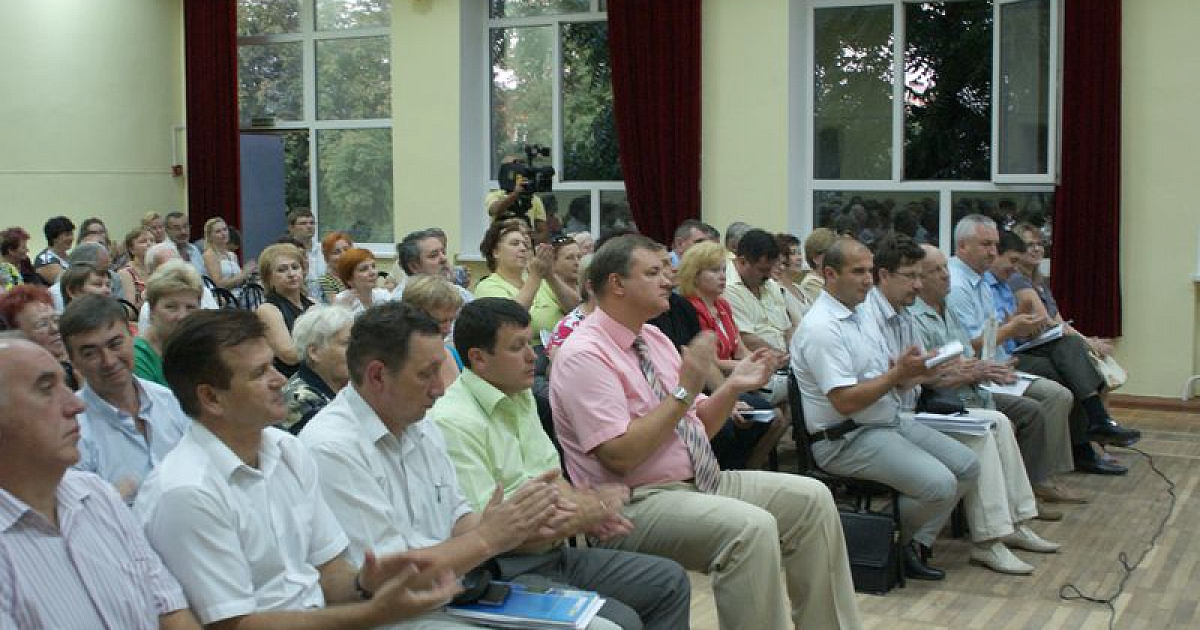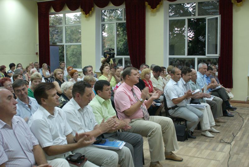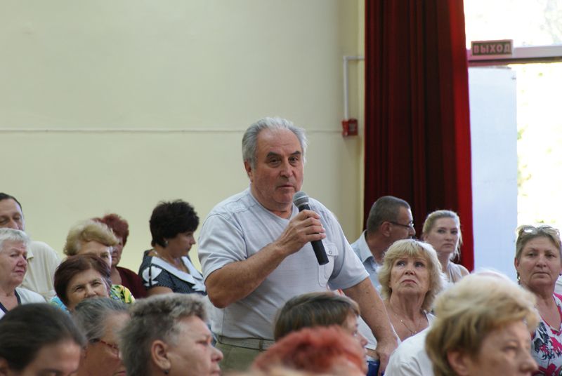 Встреча с мэром, главой администрации округа Вячеславом Литвиновым, председателем городской Думы Верой Галушко, депутатами Виктором Тимофеевым, Александром Лактионовым, Вячеславом Буренком и представителями всех департаментов и управлений администрации муниципалитета проходила в актовом зале школы №43.