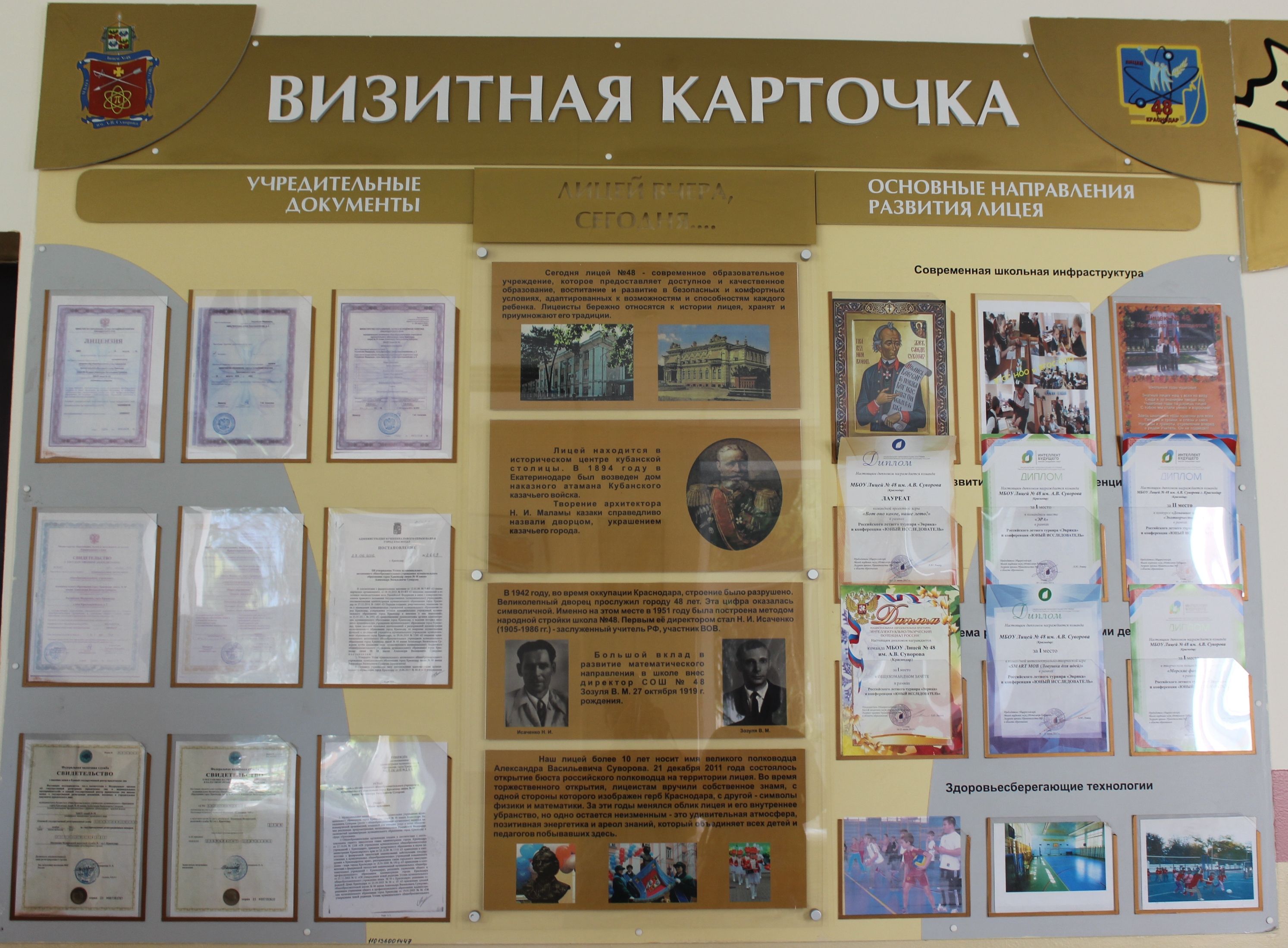 Стены 48-го лицея дышат историей: на фасаде размещена памятная доска с барельефом Николая Ивановича, а в вестибюле висит огромный стенд, рассказывающий о том, как в 1950 году общими усилиями Крайкома партии, Горисполкома и Гороно было начато строительство их школы.