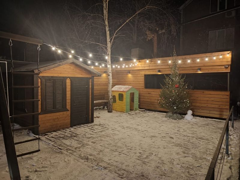 Атмосфера во дворе стала не только сказочной, но и новогодней. Жители дома установили елку, и сами всем двором украсили ее игрушками и гирляндами.