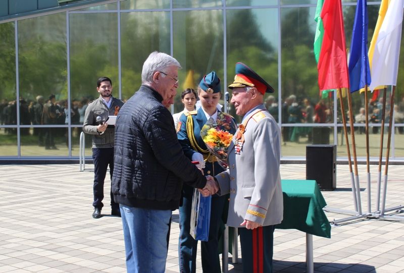 После приветственных слов Владимир Бекетов и Владимир Евланов вручили юбилейные медали «70 лет Победы в Великой Отечественной войне 1941—1945 гг." фронтовикам Константину Горожанину и Сергею Яцуку.
