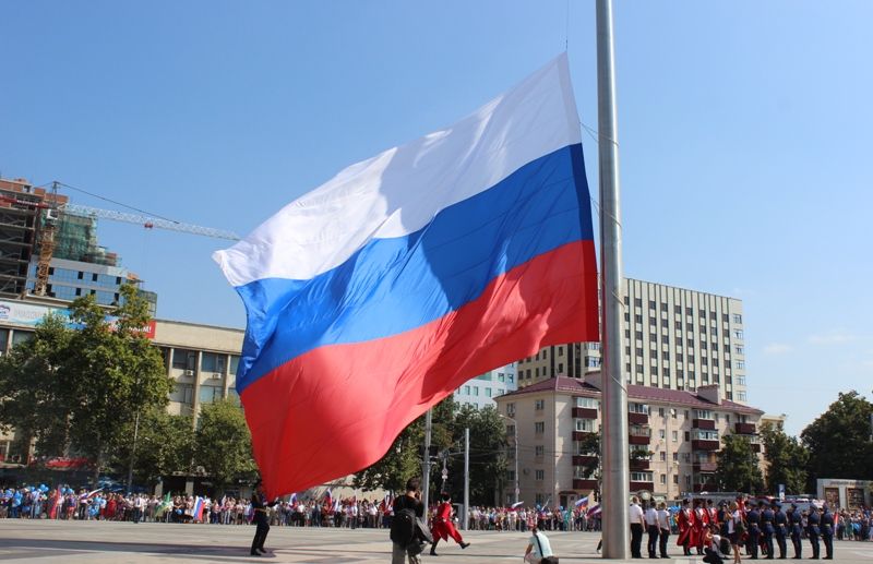 После приветственных слов руководителей города на площади состоялось водружение Российского флага на центральный флагшток.