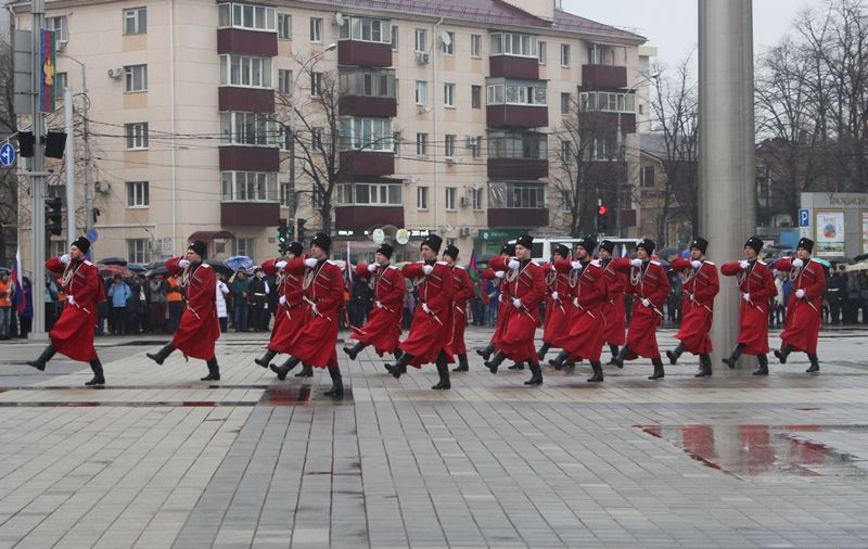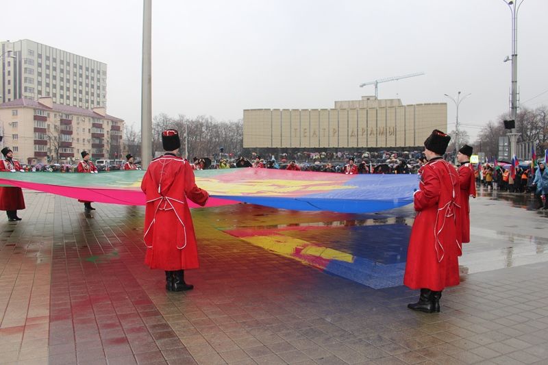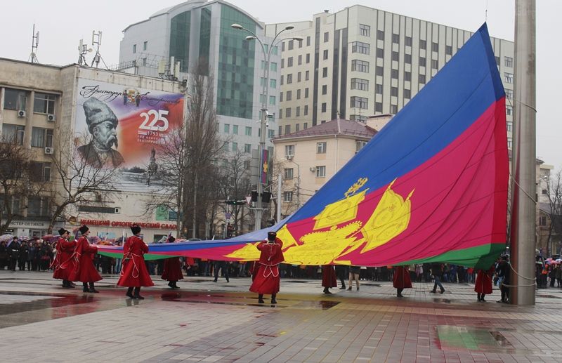 Затем казаки Почетного караула Кубанского казачьего войска внесли полотнище современного флага Краснодарского края размером 10 на 15 метров. Во время подъема на флагшток прозвучал гимн Кубани в исполнении духового оркестра.