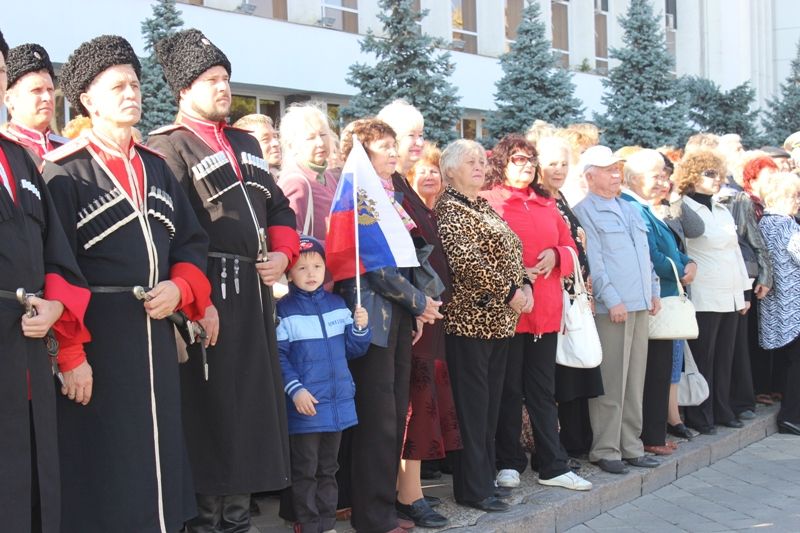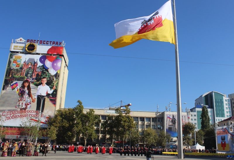 На Театральную площадь полотнище флага внесли казаки Почетного караула Екатеринодарского районного казачьего общества. На флагшток водрузили флаг муниципального образования под гимн города Краснодара. Размер полотнища флага — 10 на 15 метров.